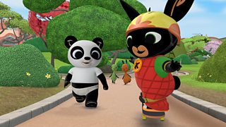 Mae Bing a Fflop yn y parc pan maent yn gweld Pando ar sgrialfwrdd. Bing and Fflop are ...