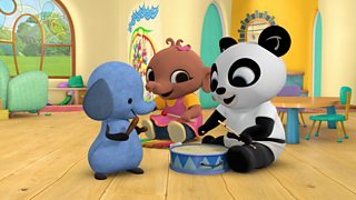 Mae'n amser cerddoriaeth yn y cylch chwarae ac mae pawb eisiau tro ar y drwm. It's musi...