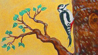 Tap, tap, tap! Flying in to visit Robin is a woodpecker with a very long beak!