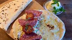 Piadina with herb ricotta, slow roast tomatoes and salami