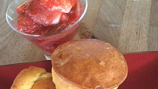 Whiskey and ginger Baba with new season rhubarb and strawberries