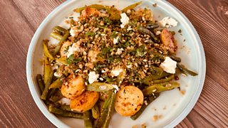 Warm n’duja, runner bean and potato salad with feta and pumpkin seed picada