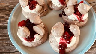 Chocolate Meringues with malted cream, berry compote