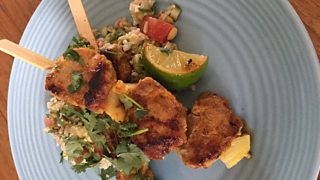 Pastor Style pork and pineapple kebabs Rice Salad with avocado, cucumber and peanut