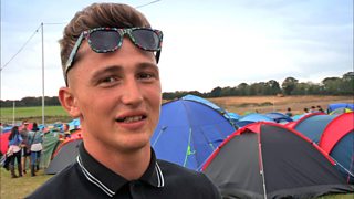 Mark pees into a bottle in the tent to the disgust of the other lads and fails to impress the the ladies when he tries to help put up their tent.