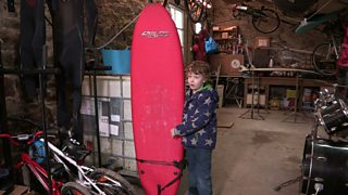 Mae Eben yn hoffi syrffio ac mae'n mentro ymhellach na'i draeth lleol i chwilio am y to...