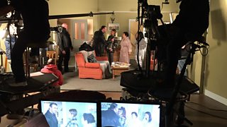 On our last visit to the set Welsh-learner Lynn is pulled up on her timing during filming