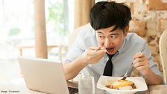 (Photo: A man eating at his desk looking at his laptop scrren. Credit: Thinkstock)