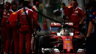 Ferrari's Sebastian Vettel questions the team's pit stop strategy.