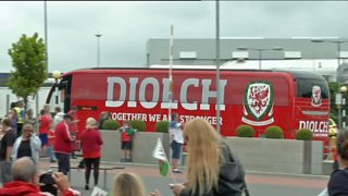 Y dorf yn stadiwm Caerdydd yn croesawu'r tîm.