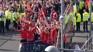 Y chwaraewyr yn cyrraedd Stadiwm Caerdydd ar gyfer y dathliadau.