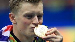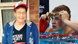 Adam Peaty's grandma watches him win a gold medal at the Rio Olympic games.