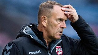 Derry City manager Kenny Shiels points an accusing finger at his defenders