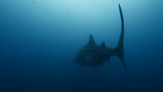 A sperm whale carcass draws the attention of several six gill sharks.
