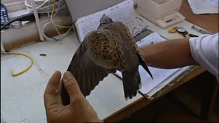 Iolo Williams sy'n helpu monitro a modrwyo adar yn Gibraltar wrth iddynt hedfan o un cy...