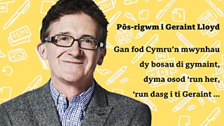 Rhys Dafis, bardd mis Mai 2018, yn gosod pos 'ar y map' i Geraint Lloyd ar ffurf rhigwm.