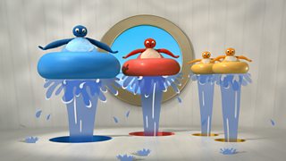 The Twirlywoos watch as a man washes his clothes and gets very wet.