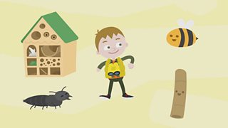 Freddie has a bug hotel, and he wants to make beds for the bugs with sticks and leaves.