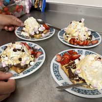 Making the best 'everything' waffle desserts at an after school tea time club for young people