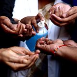 (Photo: Members of Victoria Hospital Medical staff demonstrate to the public on how to properly wash their hands using sanitiser, during awareness campaign following the coronavirus outbreak, in Bangalore, India. Credit: EPA/Jagadeesh NV)