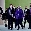 (Photo: North Rhine-Westphalia"s State Premier Hendrik Wuest, Berlin"s Mayor Michael Mueller, German Chancellor Angela Merkel and her designated successor Olaf Scholz arrive to address a news conference following a meeting with the heads of government of Germany"s federal states at the Chancellery in Berlin December 2, 2021 on measures to curb the COVID-19 pandemic. Credit: John MacDougall/Pool via REUTERS)