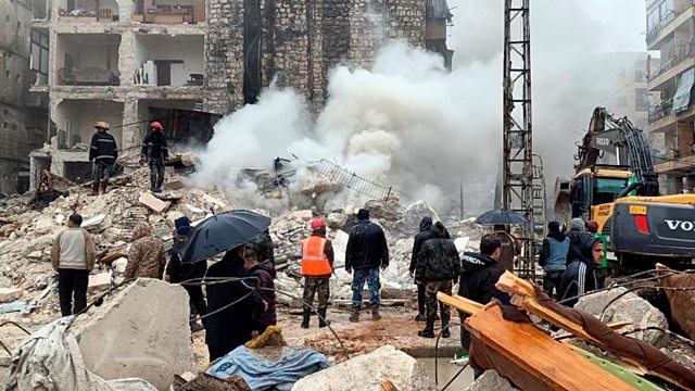 (Photo: Rescuers search for survivors at the site of a collapsed building, following an earthquake, in Aleppo, Syria, 6 February, 2023. Credit: SANA/Reuters)