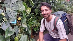 (Photo: Crowdscience presenter Anand Jagatia crouches next to a butterfly. Credit: Phil Sansom)