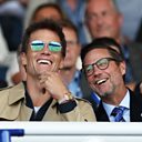 (Tom Brady, Birmingham City co-owner and film director Matt Alvarez in the stands during the match between Birmingham City and Leeds United in 2023 in Birmingham, England. Credit: Getty Images)