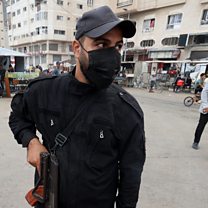 Image: A member of the internal security forces loyal to the Palestinian group Hamas, mans a checkpoint in the Gaza Strip. Photo by Eyad BABA / AFP via Getty Images.