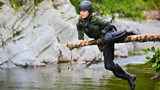 Four Warriors face challenges including Demon Causeway, Pool Plunge and Battering Ram. (R)