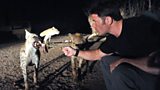 Joel and Shini are in Wales for a close-up encounter feeding crocodiles. (R)