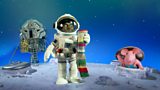 1/26 A space module lands on the Clangers planet, from which steps a human astronaut. (R)