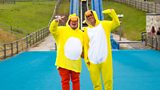 24/40 Ila tries the yoga tree pose, and James has a go at a sack race. (R)