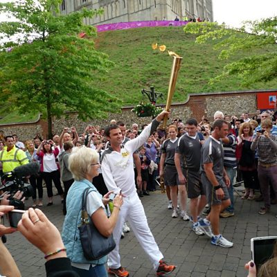 Wally Webb commentates on Paralympic gold medallist Giles Long carrying the torch.