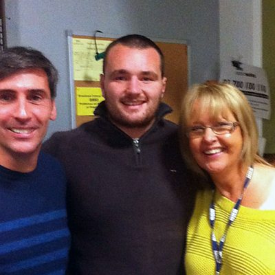 Ken Owens bachwr tim rygbi Cymru yn y stiwdio gyda Dafydd Du a Caryl Parry Jones.