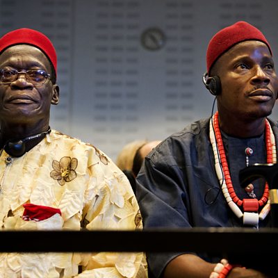 We bring together oil giant Shell and environmental group Friends of the Earth in a rare joint appearance to talk about a ruling in the Hague over oil pollution in the Niger Delta. Allard Castelein, Vice President for Environment at Shell and Geert Ritsema from the Dutch affiliate of Friends of the Earth speak to the ÃÛÑ¿´«Ã½'s Jon Bithrey. (Image: Nigerian farmers in court, AFP)