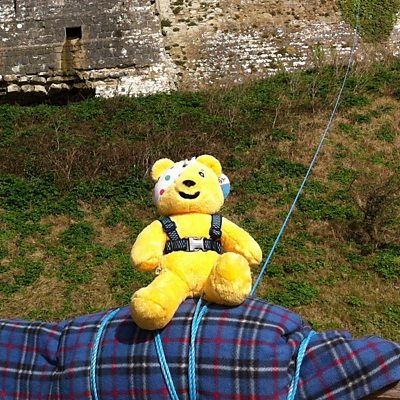 Pam White of National Trust Corfe Castle helps Pudsey complete his zip wire challenge