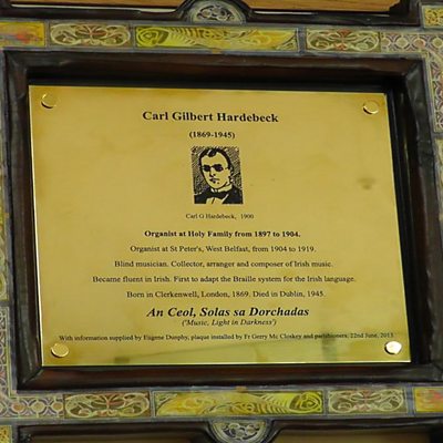 Ar an Satharn , an 22 Meitheamh 2013, nochtaÃodh leac i Séipéal an Teaghlaigh Naofa i mBéal Feirste in onóir don fhear ildánach Carl Hardebeck a rinne obair iontach do cheol traidisiúnta na Éireann agus don Ghaeilge.