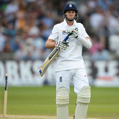 England's Joe Root is bowled out for 30 in the 1st Ashes Test at Trent Bridge.