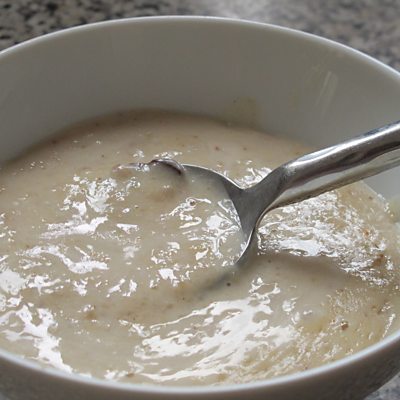 Skin bananas and chop them into pieces. Combine chopped bananas and water in a blender until it becomes a paste. Put mixture into a saucepan and let it simmer for around 45mins until it becomes smooth. Add cinnamon, bay leaves, grated nutmeg and condensed milk to taste.