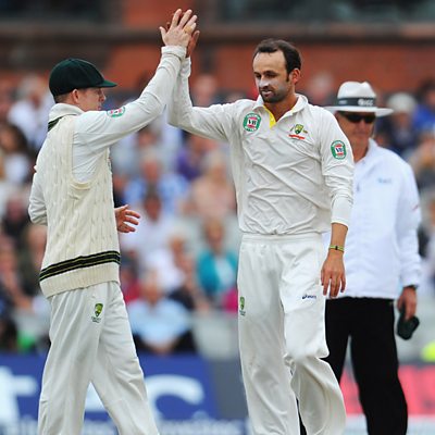 England's Stuart Broad is caught off the bowling of Nathan Lyon for 32 on the fourth day of the third Ashes Test.