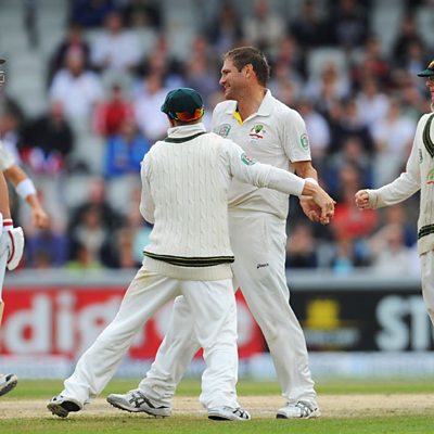England's Jonathan Trott is out for 11 caught behind off the bowling of Ryan Harris.