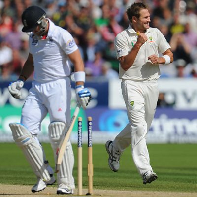 England's Matt Prior is out for 0 to the bowling of Ryan Harris.