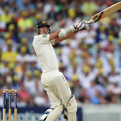 Australia's Mitchell Starc is bowled out by Graeme Swann for 13.