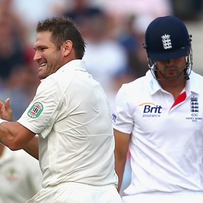 England's Alastair Cook is out for 25 from the bowling of Ryan Harris.