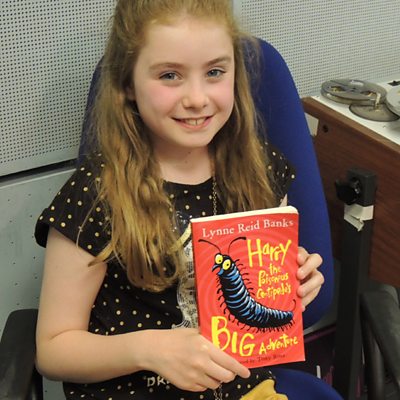 Hannah a' toirt seachad a beachd air an leabhar Harry the Poisonous Centipede's Big Adventure.