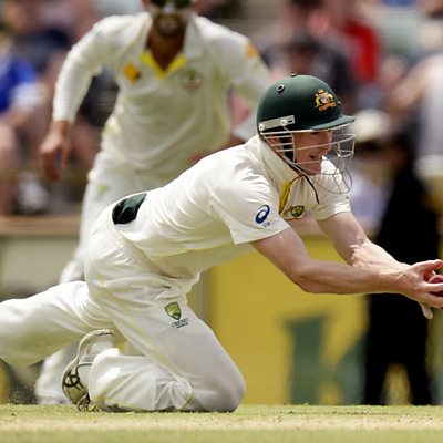 Commentary of the final wicket in the third Test at Perth, which secures the Ashes for Australia. Short and straight from Mitchell Johnson, James Anderson can only fend it to short leg, where George Bailey leaps forward to take the all-important catch.