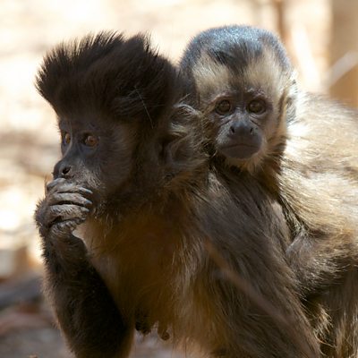 Female capuchin chattering to attract attention, with stone tool used in the background.