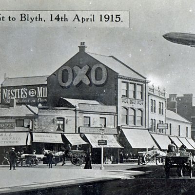 When German Naval Airship Zeppelin L9 appeared over Blyth on the evening of 14 April 1915, it was only the second time bombs had been dropped on England. Although nobody was killed, it marked the beginning of a series of raids on the North-East which would kill many dozens of people. The Zeppelin L9, on her first mission, headed inland north of Blyth and was attacked with rifle fire from the 1st Battalion Nothern Cyclists at Cambois. She then dropped bombs on West Sleekburn following a winding course over Northumberland dropping bombs as she went, before heading for Wallsend where one bomb resulted in the only casualties of the night, injuring a woman and a child. The Zeppelin then turned east and crossed the coast at Marsden. Newspaper reports at the time suggested she had missed her main target, Tyneside’s factories and shipyards. However a raid in June was much more deadly. Among those killed were 17 men at Palmer’s Works at Jarrow. Location: Hugh Street, Wallsend NE28 6RL Photograph courtesy of Beamish Museum Report presented by Jo Lonsdale