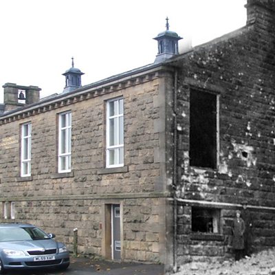 The first bombing raid of the Great War in the North West is thought to have taken place on 25 September 1916, when the Zeppelin L21 attacked Rossendale, Ramsbottom and Bolton. The airship dropped bombs on the small hamlet of Holcombe damaging the village school and killing a song thrush, the first casualty of the raid. The bird is still cared for by the school as a war memorial. The L21 moved on and circled over Bolton dropping high explosives on the centre of the town killing 13 people on Kirk Street in Deane. The scene of the attack is now where the University of Bolton stands. On returning to their base in Germany, the crew of the L21 said they had bombed Derby and had no knowledge of the damage they had caused to Bolton and Holcombe. Location: Holcombe, Bury BL8 4PA Photograph shows Holcombe school when it was bombed and as it stands today. Historic image courtesy of Bury Archives.